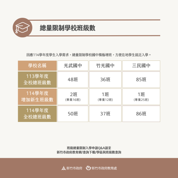教育處說明,因應114學年度學生人數增加,市府規劃總量限制學校增班計畫。光武國中新增2班(畢業16班,新增2班),竹光國中新增1班(畢業12班,新增1班),三民國中新增1班(畢業25班,新增1班),共計新增4班。