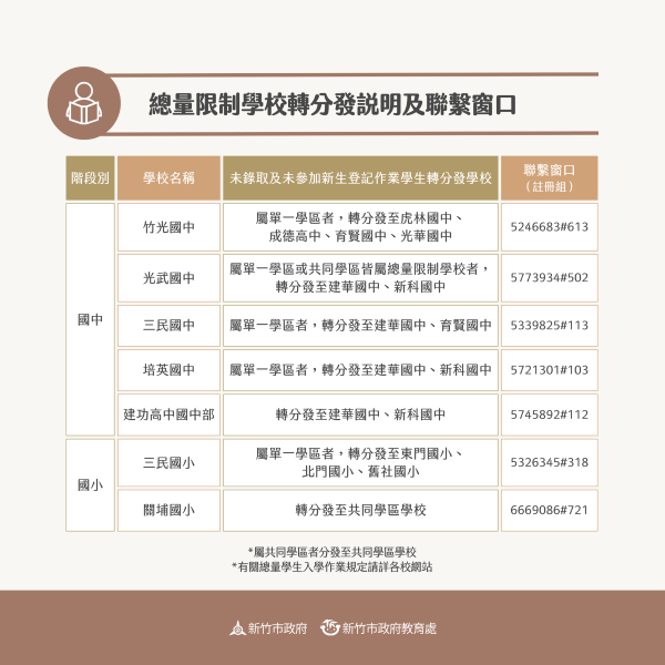 教育處提醒,114學年度總量限制學校的新生登記日為3月15日,線上報到日為3月31日至4月5日,實體報到日則為4月7日及8日,請新生家長務必留意相關期程,並於指定時間完成登記作業。如需更多詳細資訊可至官網( https://www.hc.edu.tw/ )或撥打1999將有專人服務。