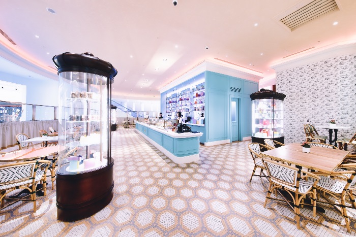 與本館相異趣的主陳列櫃檯,改以現代感十足的蒂芬妮藍展現柔美,上半截鏤空開放的外牆設計, 將視覺延伸至整個商場,馬賽克地磚營造出歐洲浪漫的低調奢華。