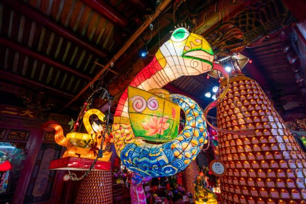 民政處表示,今年是「蛇」年,燈會現場設有許多以蛇為主題創作的花燈,透過細膩的工藝與燈光變化,展現蛇的曲線美與力量感,將創意巧思與傳統民俗完美結合,呈現出一場精彩的花燈盛會。新竹都城隍廟在管理人鄭來聖與總幹事鄭耕亞的帶領下,長期致力於傳承宗教文化,每年舉辦各類廟會活動,讓更多孩子認識在地文化與歷史,深植文化教育的種子。