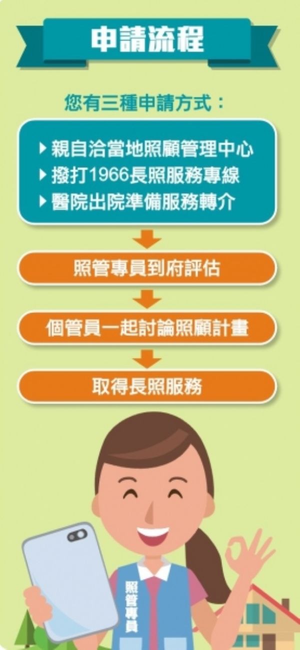 長期照顧管理中心表示,長照服務涵蓋多項資源,包括照顧及專業服務、喘息服務、交通接送服務、輔具及居家無障礙環境改善等各種服務項目,藉由醫療院所及各部門間橫向連結,提供失能民眾及其家庭照顧者個別化的照顧計畫。而在居家服務中,主要為個案提供「基本身體清潔」、「基本日常照顧」、「餐食照顧」、「陪同外出」、「陪同就醫」等可近性的照顧服務,使需要照顧協助的家庭及使用者都免煩惱,家屬也可獲得適當的喘息時間,個案亦獲得較優質的照顧服務。