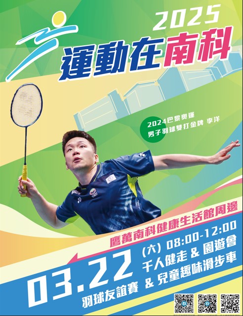 南科將於114年3月22日(星期六)上午8時至12時,在鷹萬南科健康生活館周邊舉辦「2025運動在南科」活動。本次活動以推廣全民運動、提升健康意識為宗旨,集合千人健走、園遊會、羽球友誼賽、壘球友誼賽、兒童滑步車趣味賽及摸彩等豐富活動,力求打造一場集休閒、競技與互動體驗於一身的健康嘉年華。