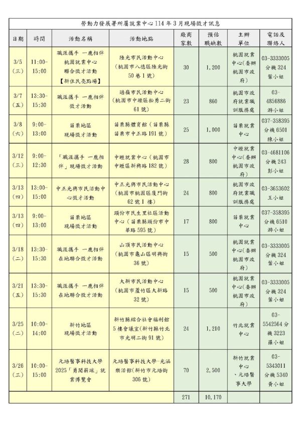 為協助求職者順利找到理想工作,並幫助企業有效招募人才,勞動部勞動力發展署桃竹苗分署將於3月在新竹、苗栗及桃園地區舉辦10場中、大型徵才活動,共邀請271家企業,提供超過1萬個職缺。每場活動現場將設有專人提供多項就業促進措施的諮詢服務,讓求職者能夠充分掌握就業資源,歡迎有求職需求的民眾踴躍參與。