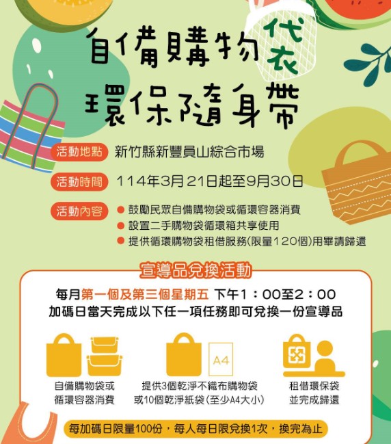 新竹縣政府環境保護局推動市場減塑行動,3月21日至9月30日將前進新豐鄉員山綜合市場辦理「自備購物袋、環保隨身帶」活動,於加碼日完成指定減塑任務,除了可以兌換衛生紙等好禮,現場更首次規劃循環購物袋免費租借服務,邀請市場攤商及消費者響應塑膠袋減量活動,買菜兼顧環保愛地球。