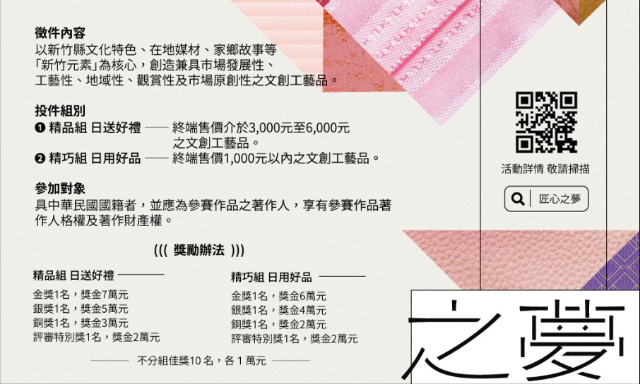 第三屆「匠心之夢」全國文創工藝競賽正式啟動!承襲前兩屆的熱烈迴響,本屆競賽即日起至6月20日開放徵件,邀請全國工藝好手發揮創意,將傳統工藝與新竹縣的文化底蘊結合,打造具備地方特色與市場潛力的文創作品,競逐總獎金41萬元,更有機會與「日日當好」品牌合作,讓創作成果真正走入市場!