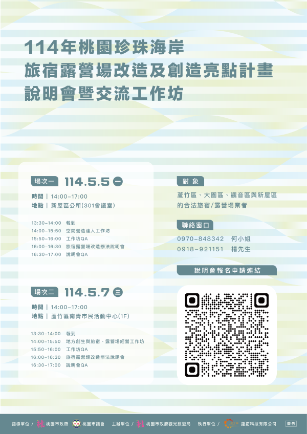桃園海岸線全長46公里,擁有草漯沙丘、觀新石滬、許厝港濕地等自然與豐富的海岸風情,同時蘊含深厚在地文化與歷史資產,如:牽罟捕魚、百年石滬及客庄海洋聚落等。桃園市政府配合交通部觀光署重要廊帶亮點營造計畫,推出114年桃園珍珠海岸旅宿露營場改造及創造亮點計畫,於5月5日及7日辦理計畫說明會暨交流工作坊,優先邀請蘆竹區、大園區、觀音區及新屋區的合法旅宿與露營場業者踴躍參與遴選,期盼透過旅宿亮點改造計畫,發揮在地文化及資源特色、營造空間創新及永續理念,提升整體服務品質與觀光吸引力,攜手打造具特色與永續性的桃園海岸旅宿新體驗。
