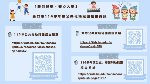 教育處表示,新竹市目前設有28所公立幼兒園及8所非營利幼兒園,除市立幼兒園(含虎林分班)、新科、建華及華德福非營利幼兒園為設籍竹市幼童皆可登記外,各國小附設幼兒園、高峰、陽光、南寮及關埔非營利幼兒園採與國小相同學區為原則辦理登記,福林非營利幼兒園則以北門與載煕國小學區辦理登記;大湖國小學區幼兒得就近登記茄苳國小附設幼兒園。4月18日已公佈各幼兒園招生簡章,招生簡章除可至各園所網站查閱外,亦公告於新竹市學前教育網(https://kids.hc.edu.tw/home )及招生網站(https://kids.hc.edu.tw/ischool/publish_page/170/ )。