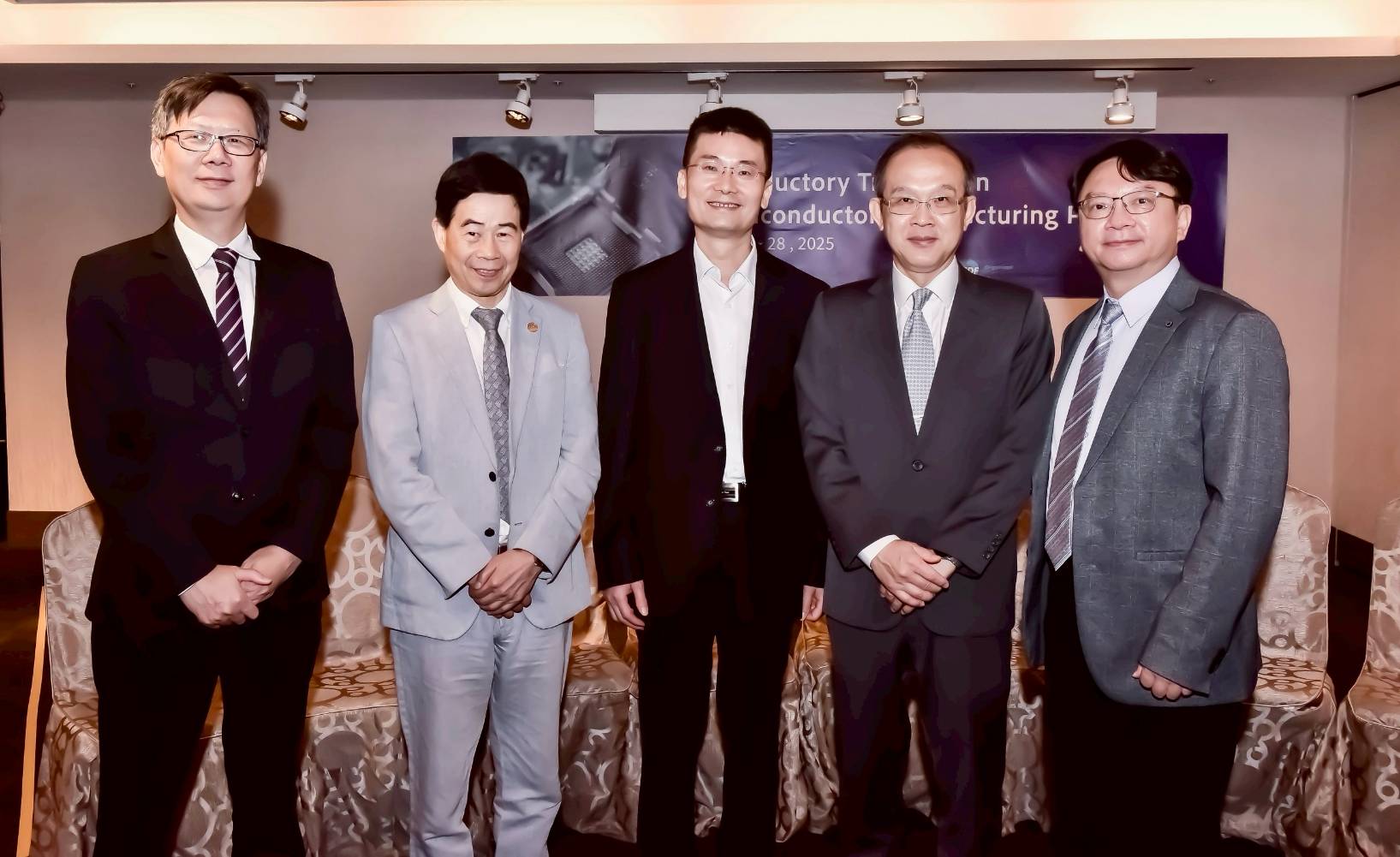 國合會開辦「2025年半導體製程技術入門訓練班」的巴拉圭、瓜地馬拉專班,國合會國際教育訓練處蔡祥吾處長(左起)、掌宇公司吳文和總經理、陽明交大電機資訊國際學位學程范倫達主任、外交部拉美司張俊彬總領事及明新科大呂明峯校長出席聯合開訓典禮
