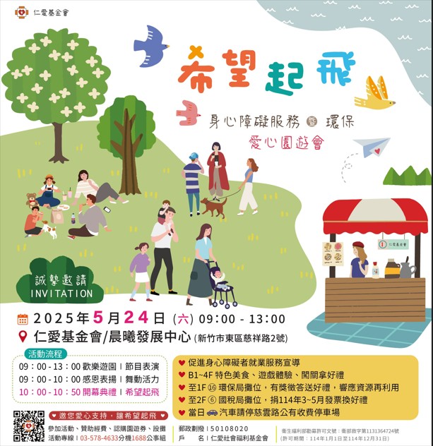 新竹市天主教仁愛社會福利基金會將於114年5月24日(星期六)上午9時至下午1時,在晨曦發展中心(新竹市東區慈祥路2號)歡樂舉辦「希望起飛.身心障礙服務暨環保愛心園遊會」,有仁愛學員的舞蹈表演及手作展示,以及聯電鼓隊、Sax Fun樂團、青少年國樂團、慈濟手語、塏欣幼兒園舞蹈與大自然快樂操等精彩表演;還有環保局與國稅局的宣導攤位、仁愛闖關遊戲,可兌換精美小禮。