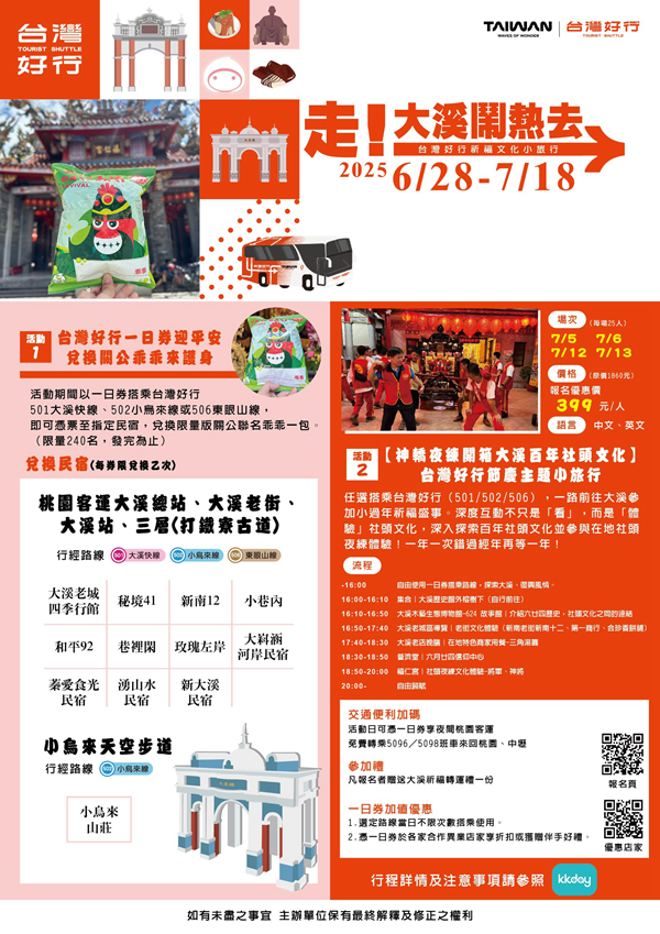 為響應「小龍年迎大龍門」年度主題,並推廣低碳綠色旅遊與文化節慶活動,桃園市政府觀光旅遊局與桃園市大溪區大溪形象商圈發展協會攜手合作,於6月28日至7月18日「大溪大禧」節慶期間推出限定版「台灣好行祈福文化小旅行」,邀請民眾搭乘台灣好行前往大溪,由專業導覽老師帶領體驗百年關公誕辰節慶、社頭職人故事、神轎夜練與品嘗老街美食,感受大溪小過年的熱鬧氛圍,行程原價1860元,推廣優惠價只要399元,CP值超高!另於節慶期間持台灣好行一日券,更可至指定民宿兌換「關公聯名乖乖」一包,象徵福氣隨行。