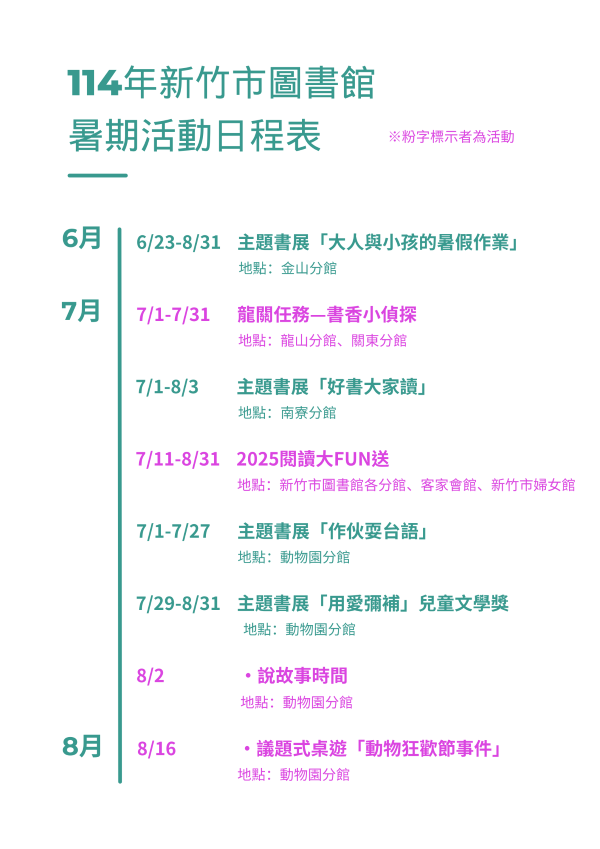 迎接暑假來臨,新竹市圖書館於今夏規劃一系列以親子共讀為主軸的閱讀推廣活動,包含主題書展、集點闖關、說故事時間與桌遊體驗,歡迎大小朋友們走進圖書館,開啟一段知識與趣味兼具的夏日旅程。