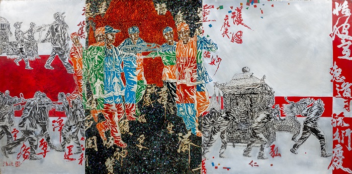 展出作品「媽祖文化意象系列」創作發想:2009年9月30日由聯合國教育科學文化組織簡稱UNESCO,審議通過登入「媽祖」為人類非物質文化遺產。每年「大甲媽祖」與「白沙屯媽祖」跨縣市繞境活動,皆成為臺灣民間信仰的年度盛會,無不牽動平日勤樸、殷實常民百姓的心。有鑑於創作來自於生活,從周邊人、事、地、物,去啓發創作思維,那是最有溫度、親切、情感與在地性。對筆者以平面繪畫創作者而言,數次徒步體驗,以似田野調查方式,親自去感受最底層庶民文化的熱情與情感,來做為創作的素材。