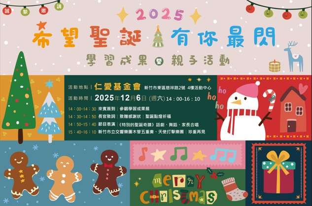 歲末佳節期間,114年12月6日(星期六)下午2:30在新竹市天主教仁愛基金會(新竹市東區慈祥路2號)舉辦【希望聖誕‧有你最閃─學習成果暨親子活動】,展現身心障礙朋友努力學習的成果,有精彩的話劇、舞蹈、合唱等多元節目,以及新竹市立交響樂團木管五重奏,讓現場彷彿置身音樂廳!