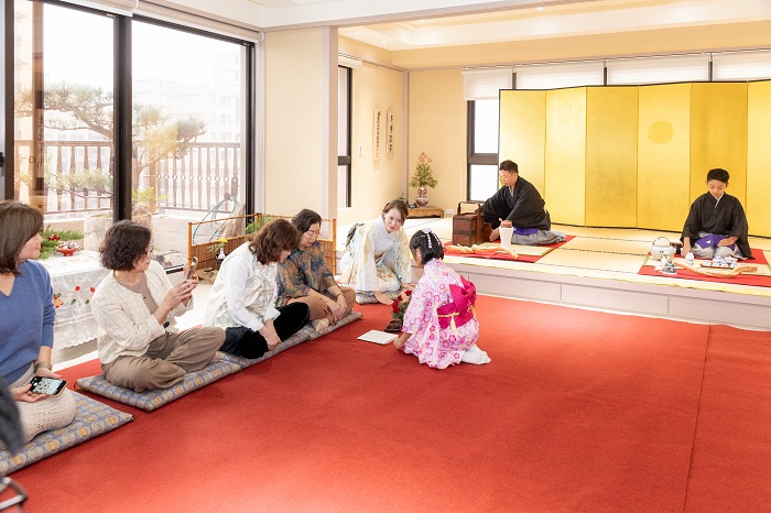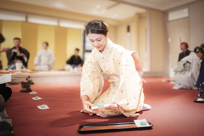 茶會依照日本皇家禮法及儀軌,行禮如儀的為16位賓客上茶湯、茶點。