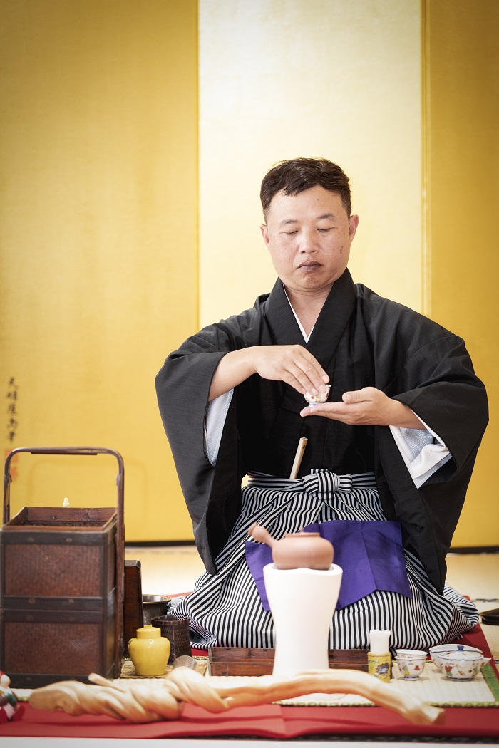 茶會出動10幾位專業茶人,包含教授群及學生們,有人在「水屋」準備,身著和服的6名「童子」,依照日本皇家禮法及儀軌,行禮如儀的為16位賓客上茶湯、茶點,茶會中每個茶人各司其職,完美的表現印證了「台上3分鐘,台下10年功」這句話。