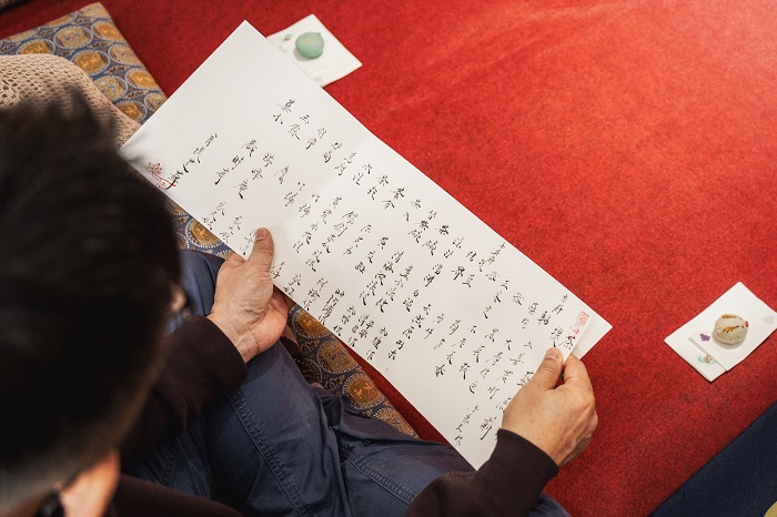 2025年末的這場煎茶會,邀請到新竹縣長楊文科夫人甘秀美作為主客,床飾的書軸「上善若水」為國家雙認定傳統木雕人間國寶李秉圭的墨寶,盛物雅題「大壽佳色」,正客定的花藝名為「不老長春」,茶棚為提籃老件及天然原形木,茶葉是頂級玉露,以兩煎茶的方式品茗,兩煎茶之間品嘗和菓子。