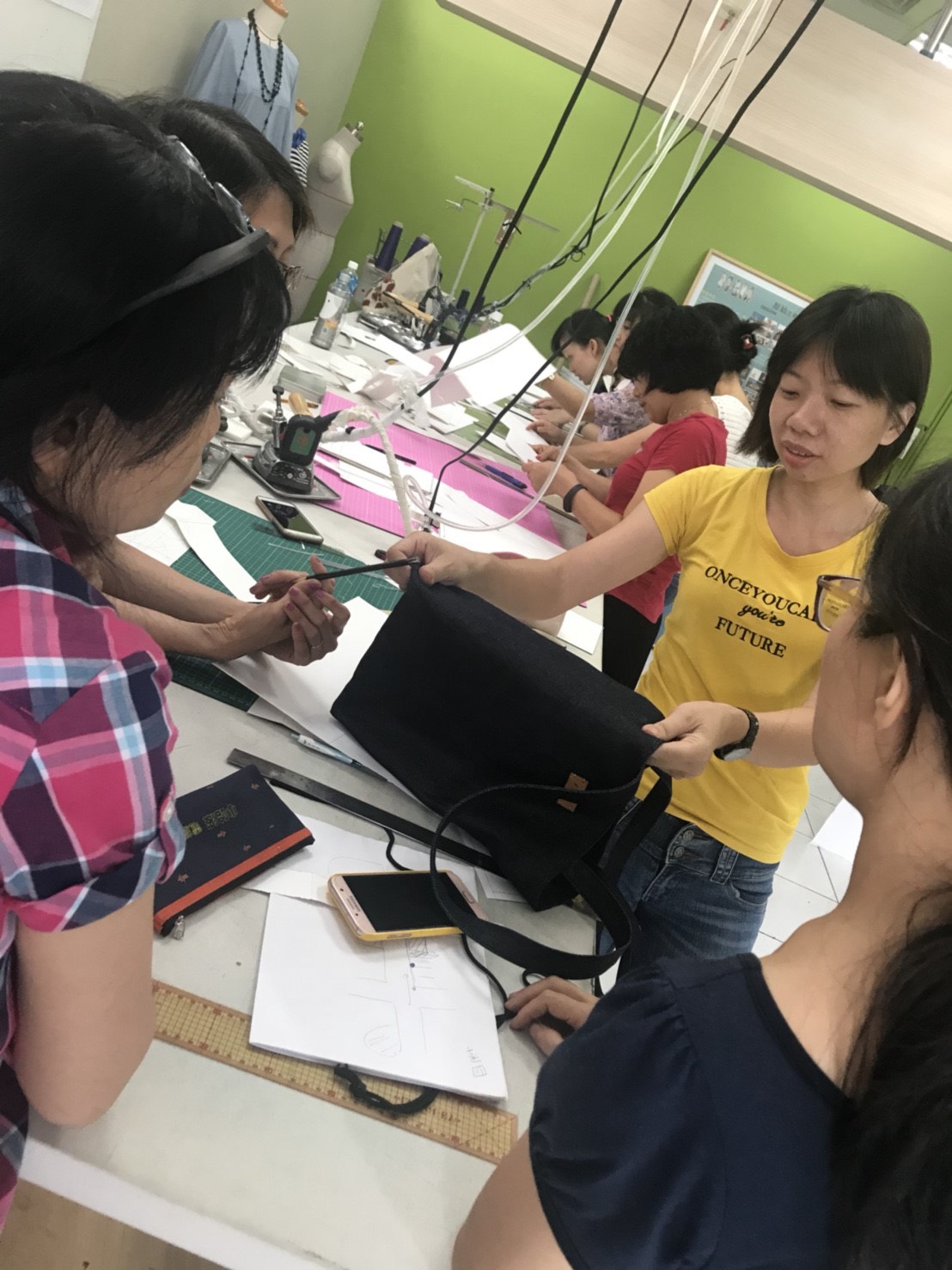 直到今年5月,盧宜透過報名新住民家庭服務中心的縫紉班,接觸到勞動部桃竹苗分署的「衣啟飛翔創客基地」,在擁有30年製作袋包類經驗的基地講師陳勝亮的指導下,讓原本就有縫紉底子的她,很快就學會袋包類的打版製作以及包包拉鍊、內裡、五金等副料的認識、採購與縫製技巧;最令盧宜興奮地是,透過基地的媒合,她不僅成功接下第一筆訂單,基地更無償提供空間與機台設備,讓盧宜可以免費使用機台接單生產。