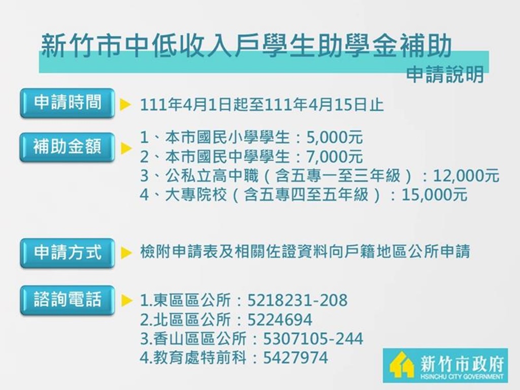 新竹市中低收入戶學生助學金4/15日前受理申請