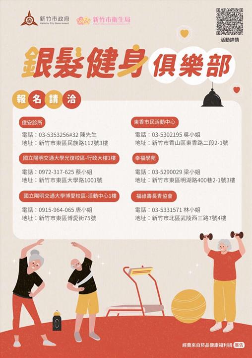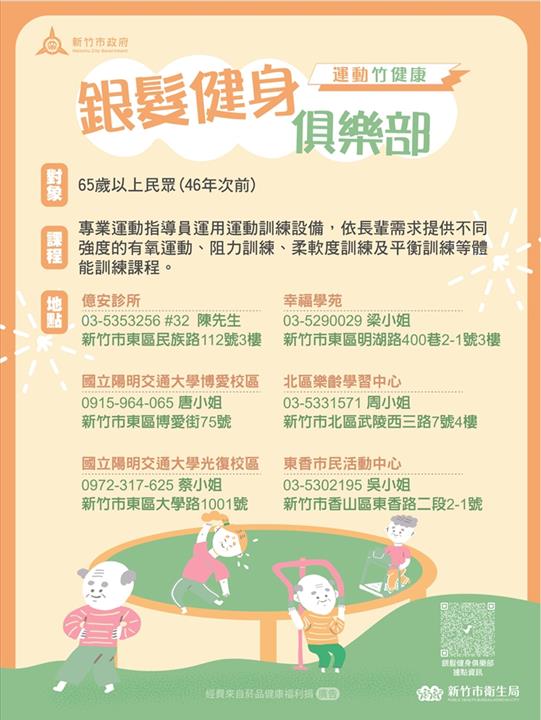 新竹市衛生局邀請65歲以上(55歲以上原住民)的高年級爺爺奶奶動起來!特別結合了竹市6個銀髮健身俱樂部據點,舉辦「高年級相聚來運動、集點送好禮竹健康」活動。即日起至11月30日前,不論是報名加入的新學