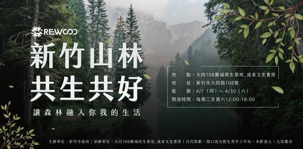 新竹市政府大同108舊城再生基地,自4月7日起至4月30日舉辦「新竹山林共生共好系列展」由或者文史書房團隊與元沛農坊、木酢達人共同企劃,以「森林融入每個人的生活」為核心,說明新竹住民與山林過往各類相互