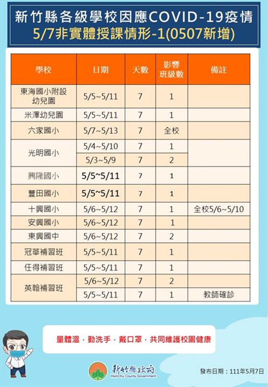 以下為0507更新暫停實體課程的學校,其中,竹北市的十興國小、六家國小,新豐鄉的新豐國小、尖石鄉的尖石國中,全校開始暫停實體課程。竹北市─1. 東海國小附設幼兒園/1名幼生確診,就讀5/5(四)至5/