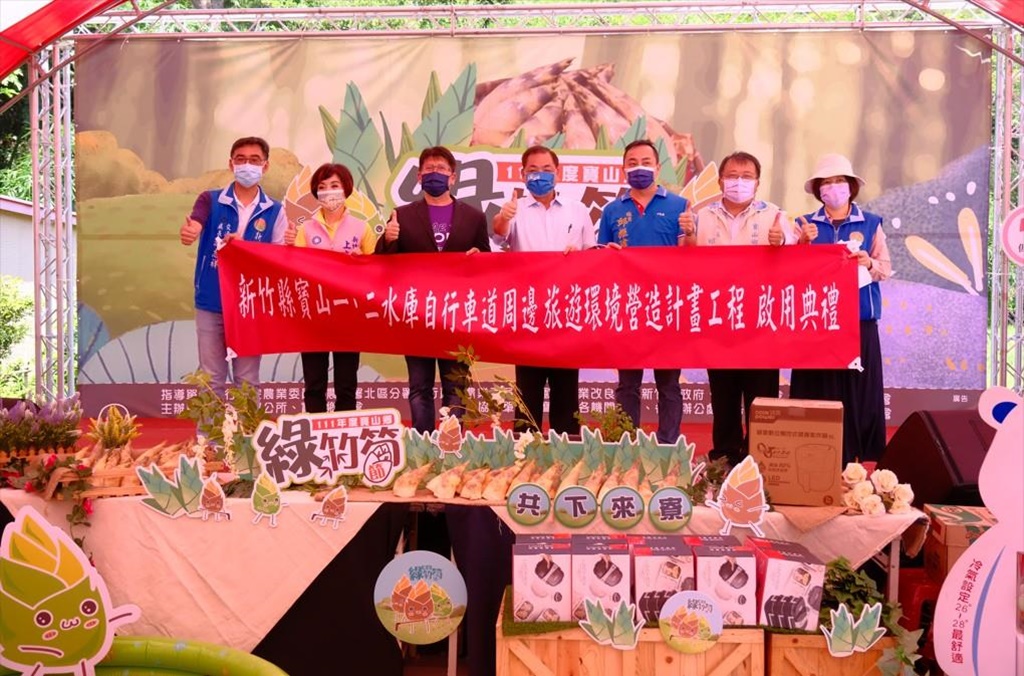 ▲新竹縣政府副縣長陳見賢(右4)與立委林思銘(左3)、寶山鄉長邱坤桶(右2)、交旅處長游志祥(左1)等人啟用大壢老仙爺廟前廣場,期望藉由營造起自行車友善旅遊空間,帶動寶山觀光旅遊、產業發展。今年寶山鄉