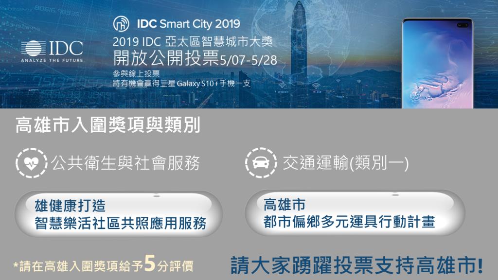 「2019 IDC亞太區智慧城市大獎」網路公開票選活動,票投高雄,得大獎。