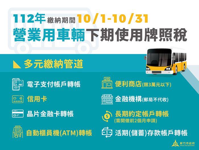 112年營業用車下期使用牌照稅將於10月1日開徵,繳納期限至10月31日,預計於9月25日寄發繳款書,新竹市稅務局提醒車主按時繳納,並鼓勵使用線上查繳稅服務,或ATM、超商與電子支付工具等多元繳稅管道