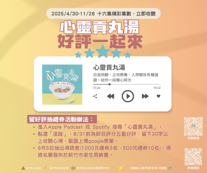 「好評一起來」抽獎活動開跑!竹市推動心理健康不打烊《心靈貢丸湯》Podcast與你談心療癒